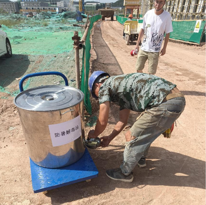 (科技物流产业园启动区过境路项目现场,为高温作业的工人送去解暑茶水和绿豆汤。)