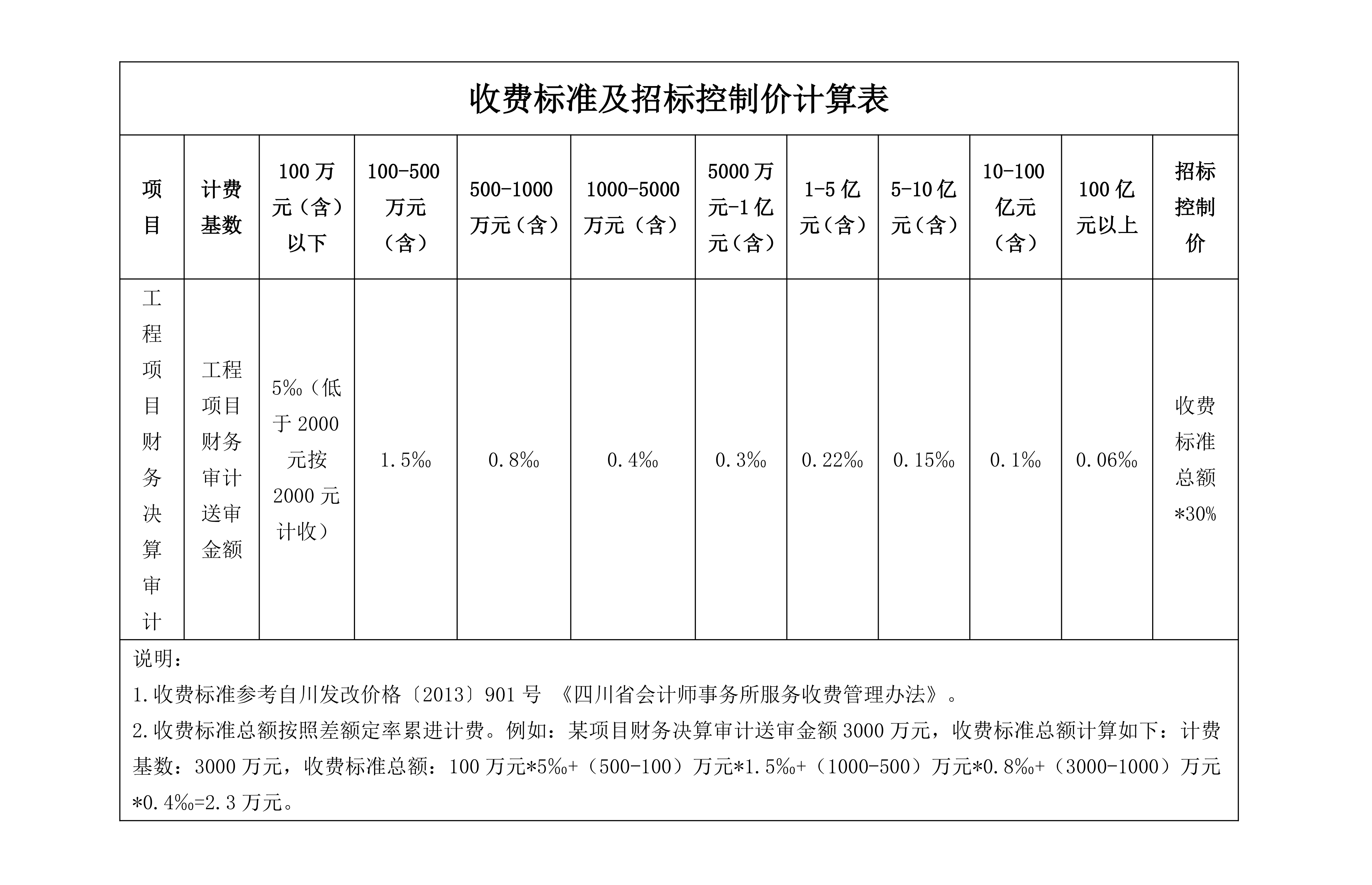 4.竞谈内容:完成2024年度6个工程项目财务决算审计服务工作,拟送审金额约9616.13万元,所需费用约28792.57元(即收费标准总额的30%)(含税6%),因无法确定最终财务决算审计送审金额,故本次审计服务费招标控制价定为收费标准总额的30%,即审计服务招标控制价参照《四川省会计师事务所服务收费管理办法》川发改价格[2013]901号计算后下浮70%,进行费率招标。