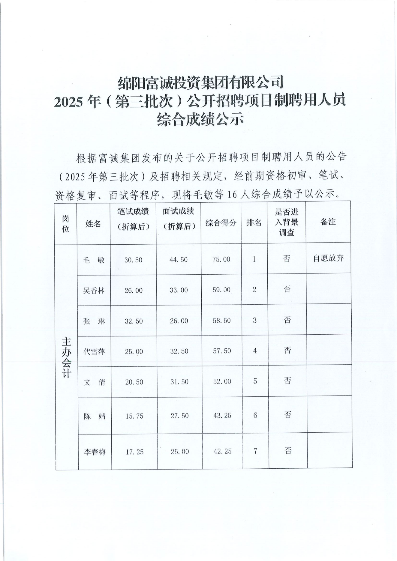 2025年(第三批次)公开招聘项目制聘用人员综合成绩公示
