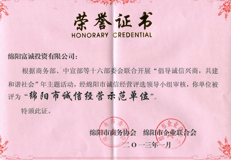 绵阳市诚信经营示范单位