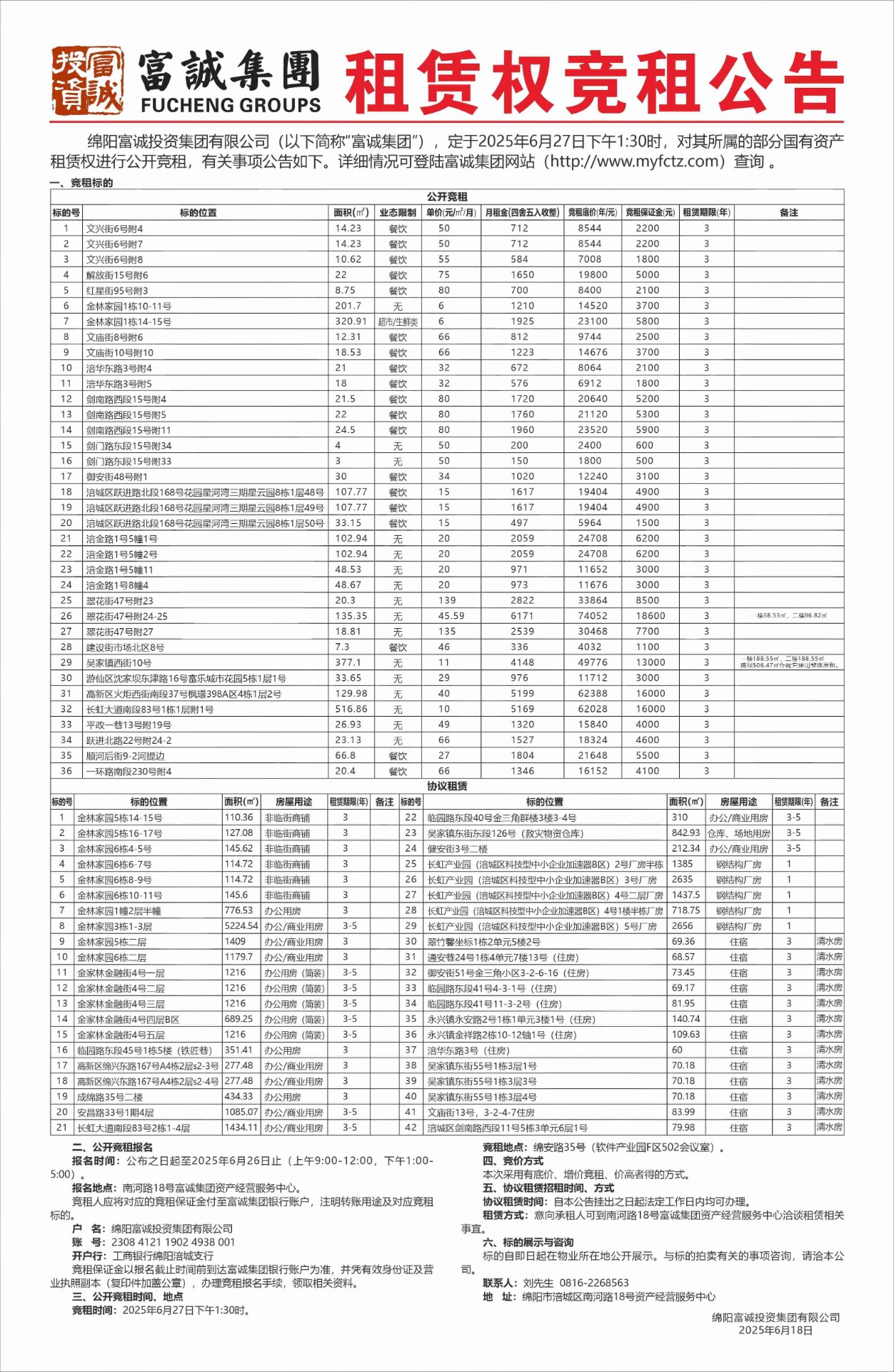 一、标的物基本情况(标的物以现场勘察的实物为准):注:①本次竞拍设备,由竞得人负责装载、运输、拆解,并承担全过程中的安全责任。②竞标人可联系转让人在2025年7月7日前(具体时间以转让人通知时间为准),至现场实地踏勘(标的物存放地点如下:绵阳市涪城区石塘商贸物流城),如有疑问可自行咨询。二、出让对象凡符合法律规定的法人、其他组织或具有完全民事行为能力的自然人。三、资料提供(一)法人、其他组织:①营业执照副本原件及其复印件(加盖公章)。②法定代表人(负责人)身份证明复印件。③单位公章。(二)自然人:身份证明原件及其复印件(若为个体工商户,可提供营业执照)。(三)委托他人代理的,需持授权委托书和委…… [更多]