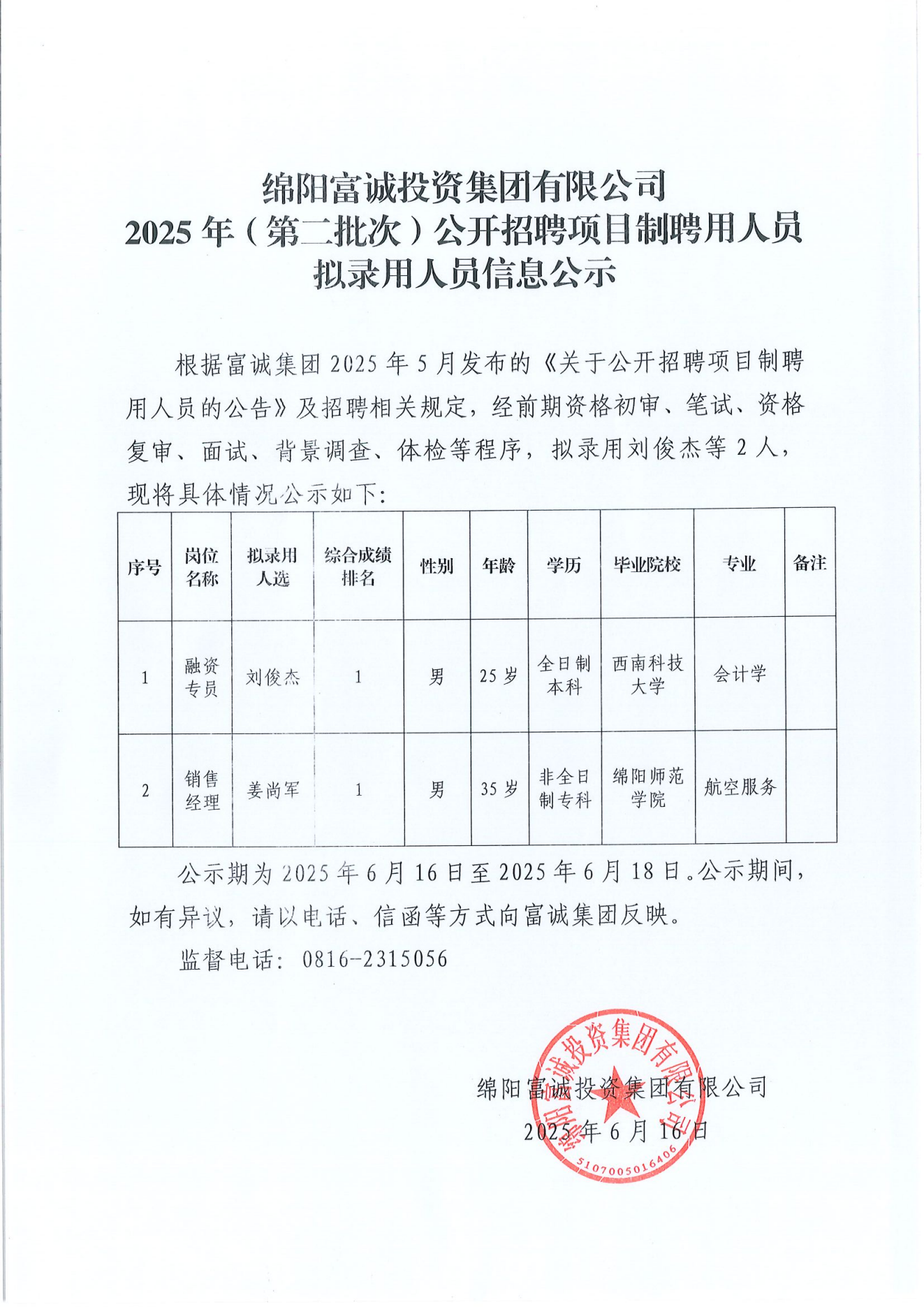 为加快推进公司建设与发展,提升市场化、专业化运营水平,经研究决定,面向社会公开招聘总经理1名。现将有关事项公告如下:一、公司简介四川涪江资本管理有限公司(以下简称“涪江资本”)成立于2024年11月15日,系涪城区区属国有企业伟德国际victor1946(以下简称“伟德国际victor1946集团”)与四川涪创发展集团有限公司共同成立的合资公司。公司注册资本金5亿元人民币,主要负责推进涪城区内基金投资整合,并参与后续基金投资项目具体工作。涪江资本秉持专业、稳健、创新的经营理念,深化与区内外企业的合作,不断拓宽投资视野,优化投资组合,努力成为推动区域经济高质量发展的新引擎。二、招聘原则坚持公开、平等、竞争、择优的原则。三、…… [更多]