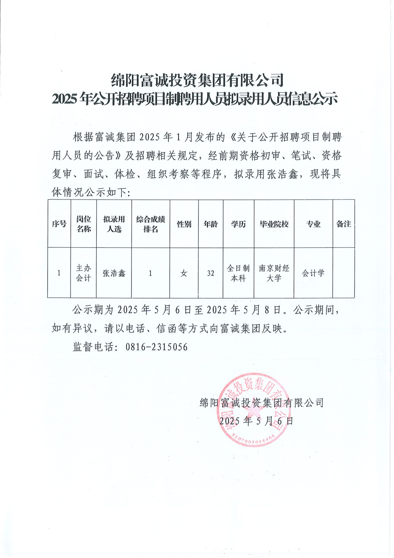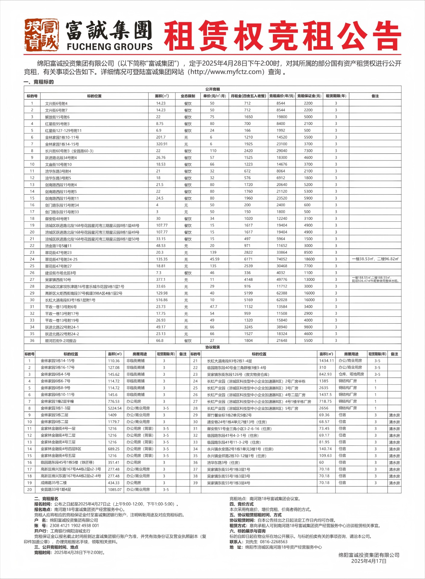 公 告 绵阳富城建筑工程有限公司本次需通过竞争性谈判公开招募涪城区临港经济发展区锂电池配套产业园基础设施建设项目—产业(绵中路—惠科光电公司)道路用地预审服务单位,此次报价采用竞争性谈判一次报价方式进行,含税招标控制价58600.00元,大写:伍万捌仟陆佰元整。报名时请提交以下材料:1、申请人有企业营业执照副本(三证合一)复印件加盖鲜章,能提供增值税专用发票。2、法定代表人身份证:法定代表人亲自到场的出示身份证原件,存复印件。若法定代表人不能亲自到场的,被委托人应出具法定代表人授权委托书原件和被委托人的身份证(查验原件,存加…… [更多]