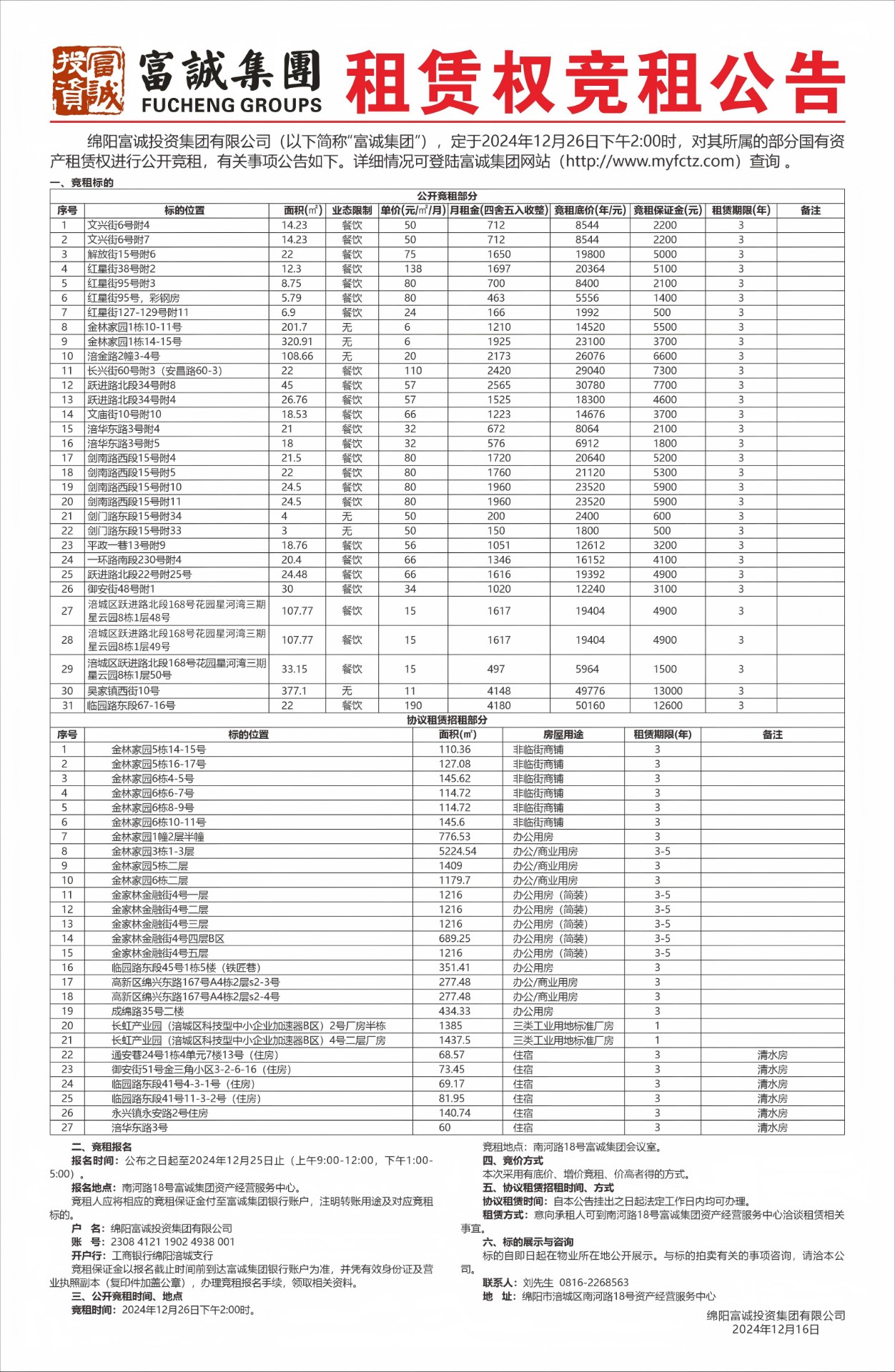 公 告 绵阳富城建筑工程有限公司本次需通过竞争性谈判公开招募绵中路零星维修项目等二个项目的竣工结算审核服务单位,此次报价采用下浮比例方式进行。报名时请提交以下材料:1、提供营业执照复印件(三证合一,加盖鲜章),能提供增值税专用发票。2、法定代表人身份证:法定代表人亲自到场的出示身份证原件,存复印件。若法定代表人不能亲自到场的,被委托人应出具法定代表人授权委托书原件和被委托人的身份证及法定代表人授权书(身份证查验原件,存加盖鲜章复印件;法定代表人授权委托书详见附件)。3、本项目不接受资格类型相同的企业组成联合体参选。…… [更多]
