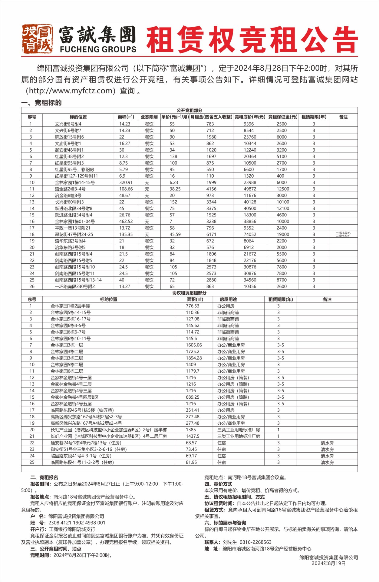 公 告 绵阳富城建筑工程有限公司本次需通过竞争性谈判公开招募中国(绵阳)科技城循环经济产业园厂房及配套基础设施建设项目(二期)—中国(绵阳)科技城循环经济产业园污水处理厂及管网建设工程前期咨询服务单位,此次报价采用竞争性谈判一次性报价方式进行。报名时请提交以下材料:1、提供营业执照复印件(三证合一,加盖鲜章),能提供增值税专用发票。2、法定代表人身份证:法定代表人亲自到场的出示身份证原件,存复印件。若法定代表人不能亲自到场的,被委托人应出具法定代表人授权委托书原件和被委托人的身份证及法定代表人授权书(身份证查验原件,存加盖鲜…… [更多]