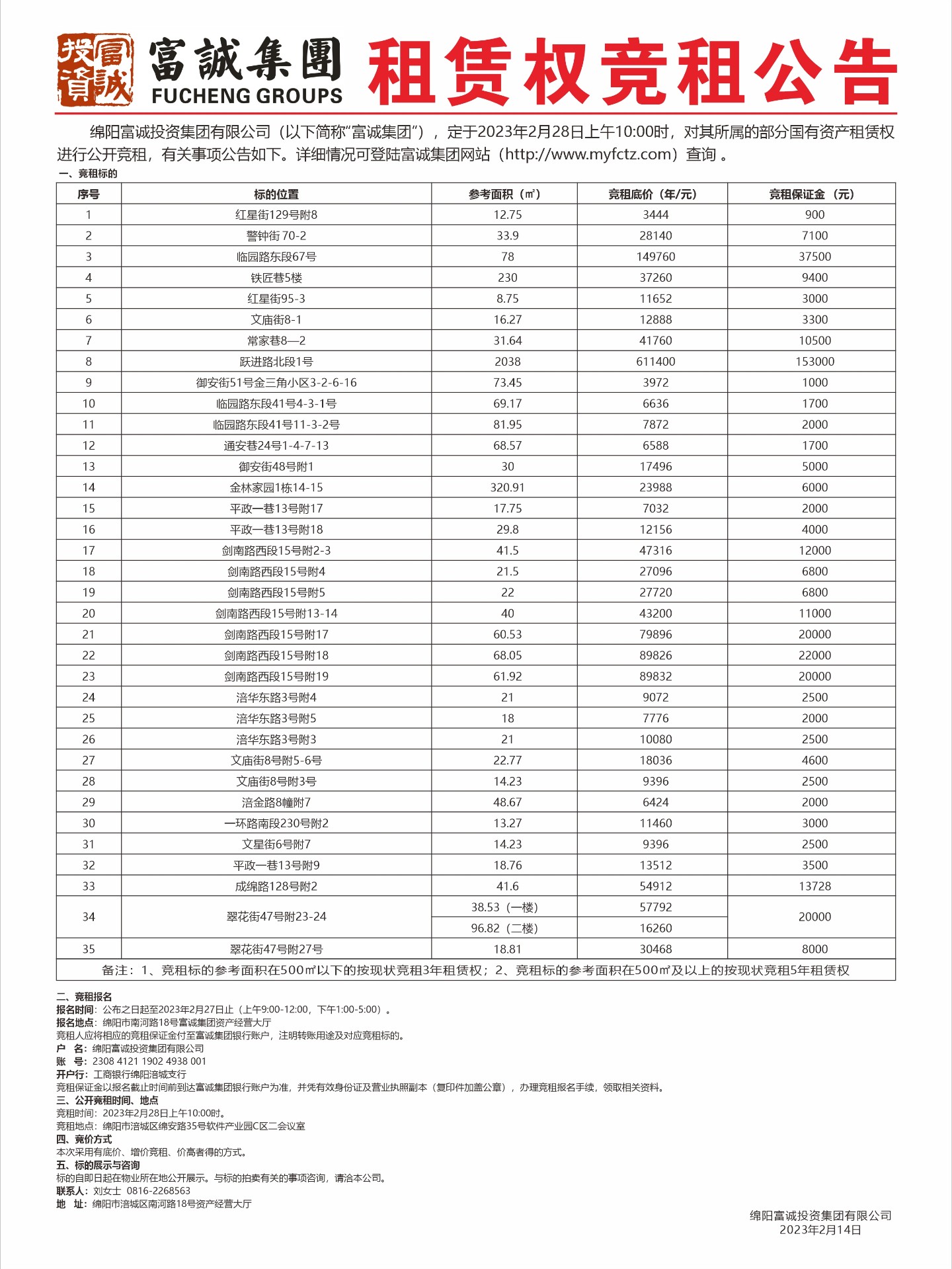 公 告 绵阳富城建筑工程有限公司本次需通过竞争性谈判公开招募绵阳临港产业园创新产业标准厂房项目招标代理服务单位,此次报价采用总价报价方式进行。报名时请提交以下材料:1、提供营业执照复印件(三证合一,加盖鲜章),能提供增值税专用发票。2、法定代表人身份证:法定代表人亲自到场的出示身份证原件,存复印件。若法定代表人不能亲自到场的,被委托人应出具法定代表人授权委托书原件和被委托人的身份证及法定代表人授权书(身份证查验原件,存加盖鲜章复印件)。报名时间:2023年3月6日至2023年3月8日上午09:00- 12:00,下午13:0…… [更多]