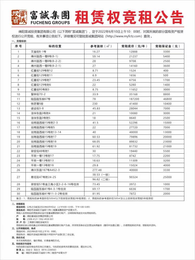 一、项目基本情况(一)业主单位:绵阳富城建筑工程有限公司;(二)项目名称:绵阳市涪城区临港产业发展区创新产业园项目;(三)项目地址:富城建工临港产业发展园区内外;(四)预算控制价(不含税):人民币55000元;(五)竞争性谈判内容:园区绿色围挡二厘米厚度白色PVC板雕刻字标语的设计制作、安装及围挡喷绘画面制作安装;二、竞争性谈判申请人(简称申请人)必须具备的资格条件(一)企业营业执照副本(竞争性谈判申请人须在中国境内注册,具有独立法人资格的合法企业,经营范围含:国内广告的设计、制作、发布、代理,标识标牌设计制作、图文设计制作等);(二)法人代表身份证。若法人代表不能亲自到场,被委托…… [更多]